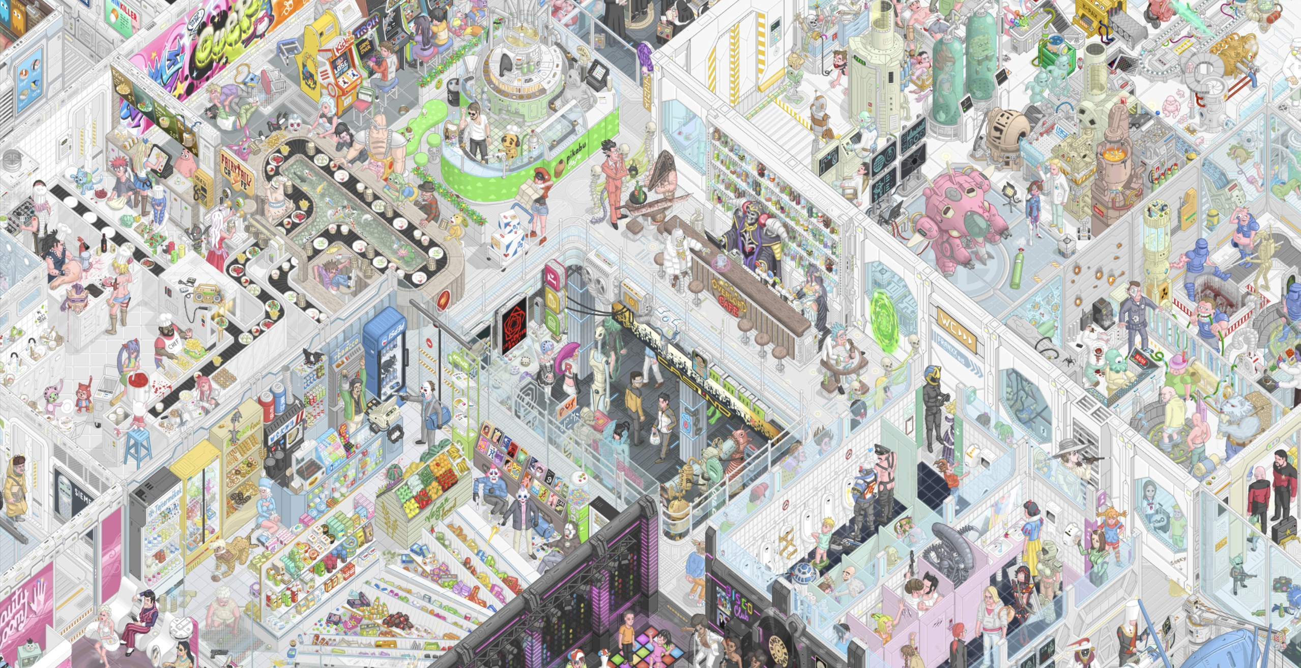 Когда открываете floor796.com, браузер загружает одну большую анимационную карту — «796-й этаж» вымышленной космической станции. Вся сцена собрана вручную: сотни мини-блоков соединяются в единую панораму. Каждый блок — маленький эпизод с собственными героями, предметами и движением.