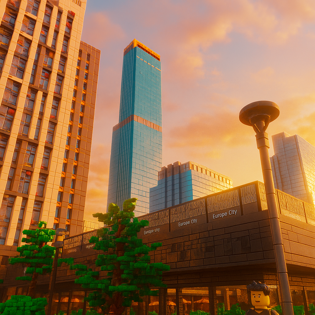 Transform my photo into a LEGO world. Recreate the entire scene in a hyper-realistic LEGO diorama style: everything is made from real LEGO bricks, plates, and minifigures. Vibrant plastic colors, visible joints and studs, a glossy yet slightly textured surface. NO real human facial features, skin textures, or hair—only LEGO shapes and materials. Warm sunset lighting, global illumination, volumetric lighting, depth of field, 4K resolution, cinematic quality, and high-quality shaders (SEUS/BSL/RTX).