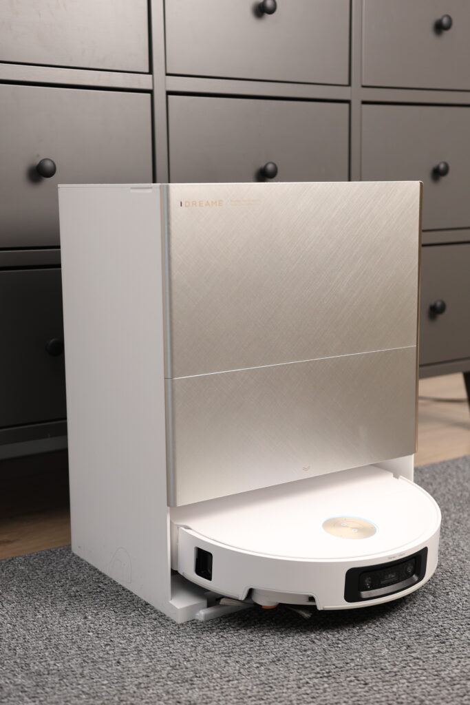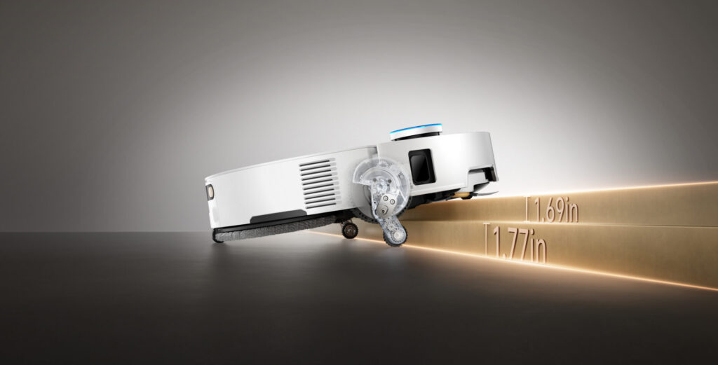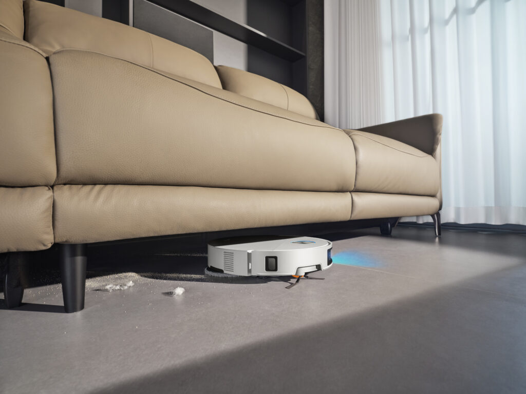 Например, Dreame X60 Ultra Complete — это уже совсем другой уровень. Во-первых, он ультратонкий: всего 7,95 см в высоту благодаря выдвижному лидару. Когда нужно заехать под диван, кровать или низкую мебель — лидар убирается, и робот спокойно туда пролезает.