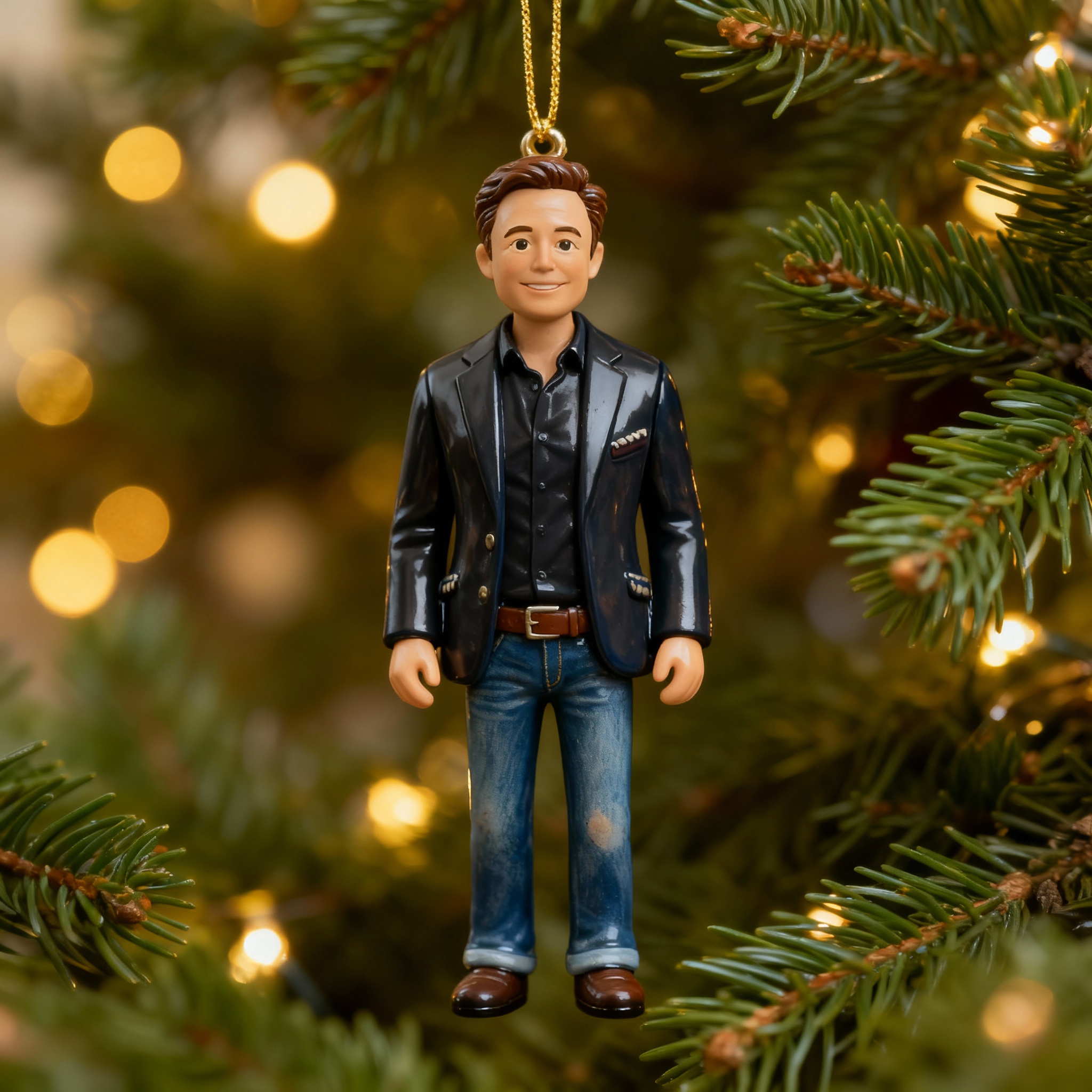 Ultra-realistic Christmas tree ornament inspired by the uploaded photo, transformed into a small handcrafted full-body holiday figure. Accurate facial likeness from the uploaded image, even if the source photo is a portrait.