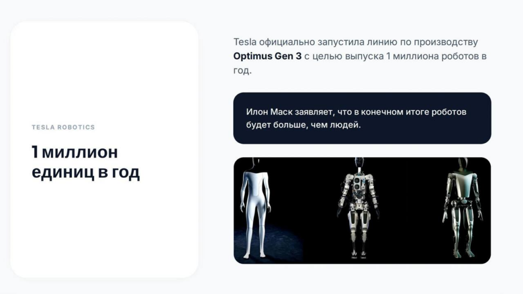 Масштаб Tesla: Илон Маск запустил линию Optimus Gen 3 с целью выпуска 1 миллиона роботов в год. Скоро машин станет больше, чем людей.