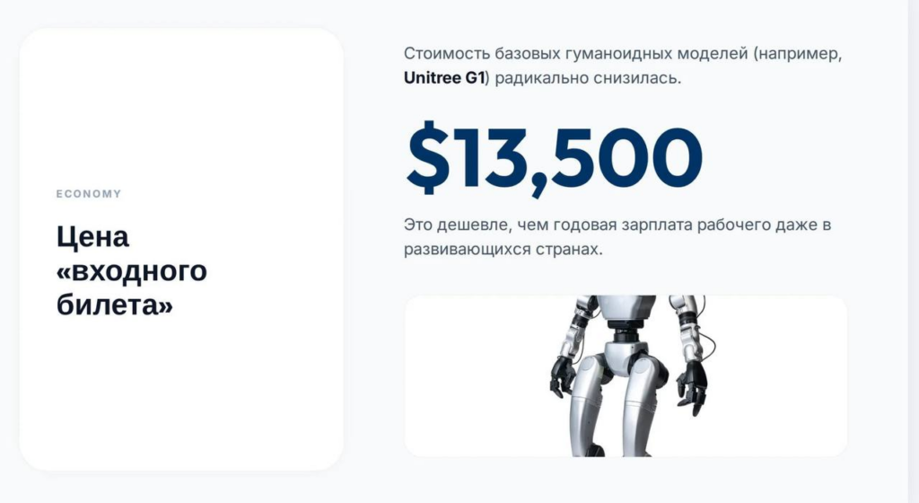 Роботы дешевле людей: стоимость базовых гуманоидных моделей, например, Unitree G1, радикально снизилась до $13 500. Это уже дешевле, чем годовая зарплата рабочего даже в развивающихся странах. Это ваш новый «входной билет» в экономику будущего.