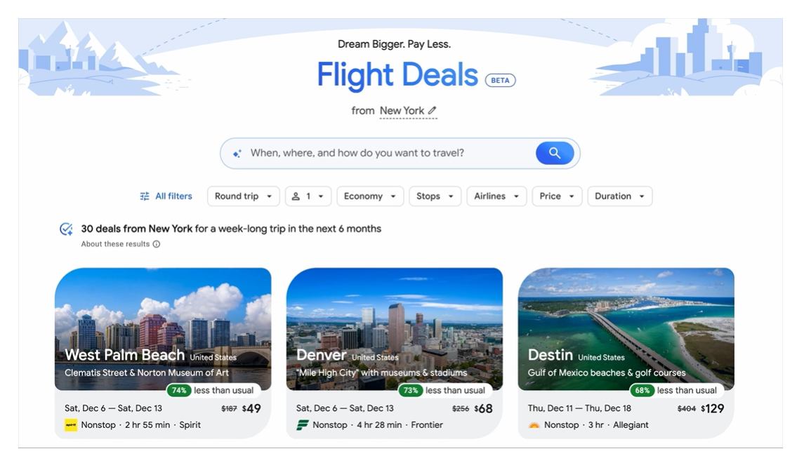 Компания расширила доступность Flight Deals — AI-сервиса для поиска выгодных авиапредложений. Он уже работал в США, Канаде и Индии, а теперь стал доступен более чем в 200 странах и на 60+ языках.