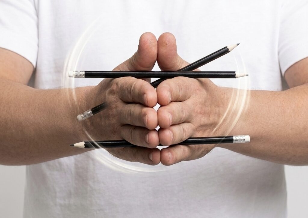Берем карандаш, кладем его на ладони и фиксируем большими пальцами. Затем начинаем прокручивать карандаш руками так, чтобы он поочередно оказывался то снизу, то сверху. Движения выполняем сначала медленно, затем постепенно ускоряемся.