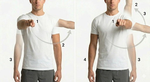 Правая рука: вперед, в сторону, вниз — делаем небольшую паузу и повторяем. Затем подключаем левую руку: вперед, вверх, в сторону, вниз — и снова повторяем эту последовательность. После этого выполняем движения одновременно обеими руками: правая — вперед, в сторону, вниз, левая — вперед, вверх, в сторону, вниз. В моменты, когда движения пересекаются, не спешите — выдерживайте паузу 5-10 секунд, чтобы спокойно принять решение и выполнить движение правильно.